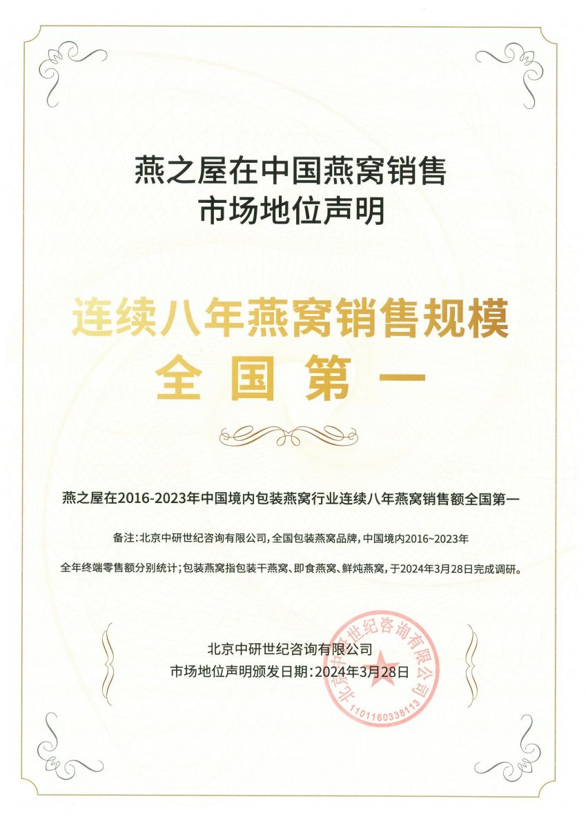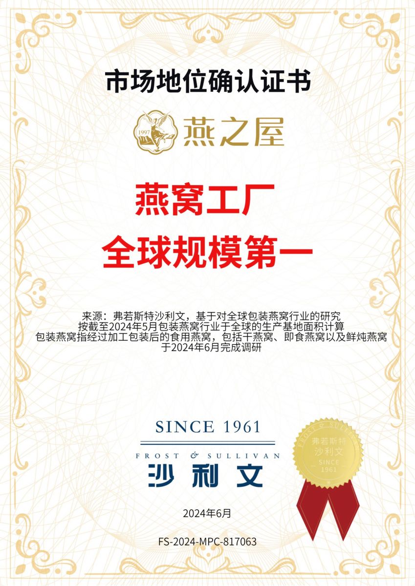 再顯實(shí)力!燕之屋獲沙利文市場(chǎng)地位確認(rèn)證書,燕窩工廠全球規(guī)模第一