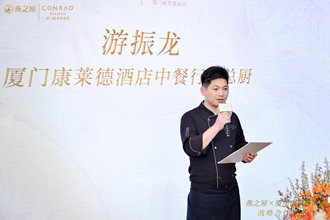 廈門康萊德酒店總經(jīng)理莫永泉也對(duì)此次合作滿懷期待,他在致辭中說(shuō)道:“燕之屋作為一家26年的燕窩專營(yíng)企業(yè),是中國(guó)上市的高品質(zhì)燕窩品牌,擁有廣泛的知名度與美譽(yù)度??等R德品牌成立于1982年,是百年酒店管理公司希爾頓集團(tuán)旗下的奢華酒店品牌,倡導(dǎo)自信、創(chuàng)新與融合,我們的合作一拍即合。我們都知道好的菜品跟主廚的理解、烹飪方法和對(duì)食材品質(zhì)的挑剔,缺一不可。燕之屋的燕窩品質(zhì)是首屈一指的,非常榮幸可以有機(jī)會(huì)和燕之屋一起研發(fā)菜單。”