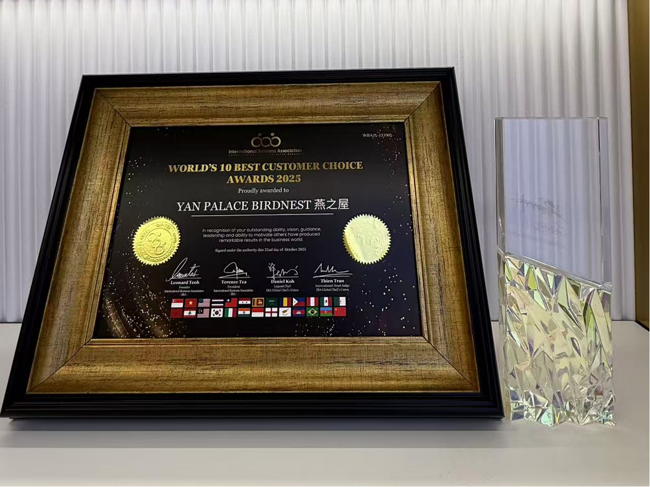 圖:燕之屋榮獲2025國(guó)際商業(yè)協(xié)會(huì)(IBA)大獎(jiǎng)——全球十大最佳客戶選擇獎(jiǎng)