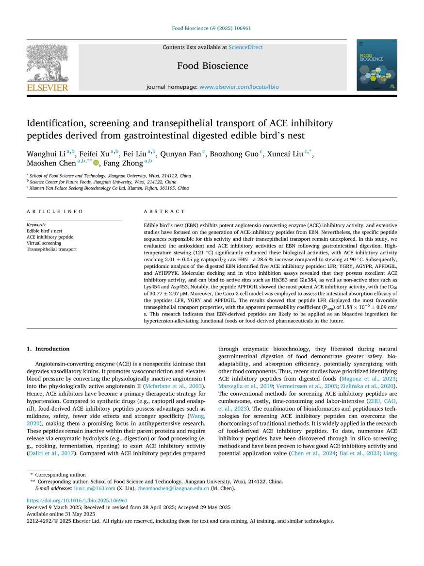 ⑥Identification, screening and transepithelial transport of ACE inhibitory peptides derived from gastrointestinal digested edible bird's nest(燕窩消化后衍生的ACE抑制肽的鑒定、篩選及跨上皮轉(zhuǎn)運(yùn))[J]. Food Bioscience, 2025: 106961.