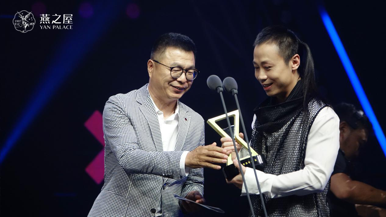 圖:廈門燕之屋生物工程發(fā)展有限公司總裁鄭文濱為“年度最佳男歌手”戴荃頒獎