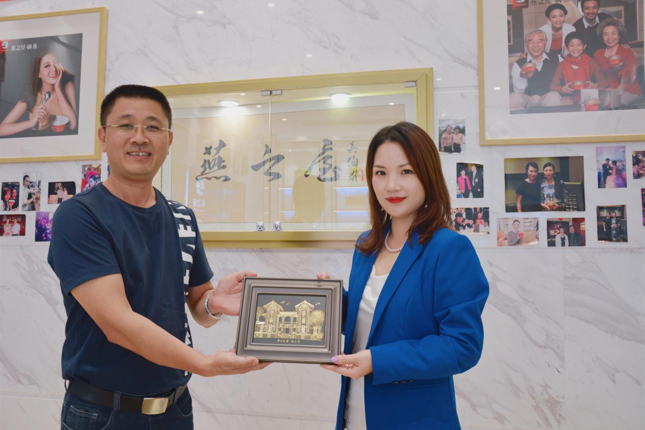 隨后,周常林班長代表中山大學(xué)第51期總裁班全體成員向燕之屋贈(zèng)予《中山大學(xué)·懷士堂》珍貴手工藝作品,懷士堂是中山大學(xué)的標(biāo)志性建筑之一,孫中山先生也曾在此向青年學(xué)子作過長篇勉勵(lì)性演講,頗有紀(jì)念意義。燕之屋也慷慨謝贈(zèng),向每位到訪師生贈(zèng)予珍貴的燕之屋燕窩面膜作為回禮。