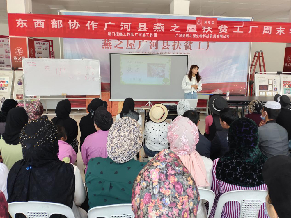燕之屋廣河縣扶貧工廠負(fù)責(zé)人蔡智興表示:“燕之屋是一家當(dāng)?shù)厝思议T口的企業(yè),員工多為當(dāng)?shù)厣絽^(qū)貧困群眾易地搬遷的小區(qū)住戶(離工廠僅100米以內(nèi)的距離),有如此優(yōu)越的地理?xiàng)l件,希望大家積極到工廠參加周末學(xué)堂、日常培訓(xùn)等,努力提升自己的文化水平。在中央、省、市各級(jí)領(lǐng)導(dǎo)的幫扶下,員工們應(yīng)該把握住機(jī)遇,為自己的生活水平、下一代的健康發(fā)展努力奮斗!”