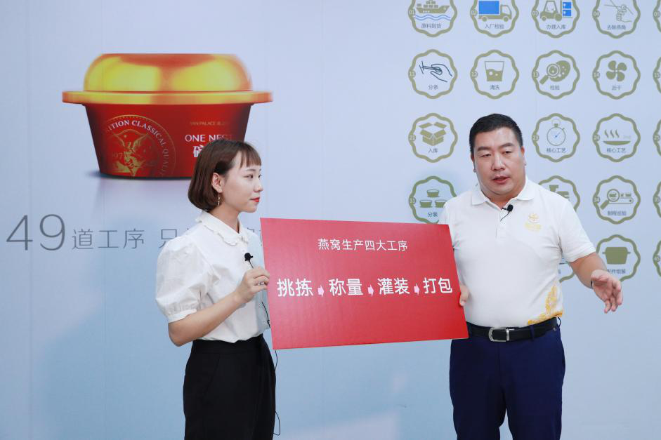 直播當(dāng)晚除了超大福利放送外,李有泉還通過燕窩產(chǎn)品制作的四大主要工序——挑揀、稱量、灌裝、打包四道環(huán)節(jié),為粉絲們介紹燕之屋強大的產(chǎn)品科研實力、以及細(xì)致嚴(yán)謹(jǐn)?shù)纳a(chǎn)工藝,并在直播最后邀請了一位客戶嘉賓到現(xiàn)場面對面對話,聆聽消費者的真實體驗和感受,針對幾個消費者最關(guān)心、最想知道的問題作出解答。