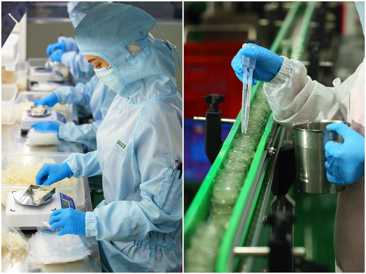 燕窩是大自然給予人們珍貴的食物饋贈,所以成就一碗好燕窩從源頭抓起很重要。跟隨直播間的鏡頭,大氣明亮、整潔衛(wèi)生、規(guī)范有序的燕之屋挑揀車間呈現(xiàn)在眾人面前。燕之屋目前擁有2大GMP無塵挑揀車間,共可容納800多名挑揀師。為保證整個挑揀環(huán)節(jié)安全無菌,每一名進(jìn)入挑毛車間的挑揀師,需穿戴嚴(yán)密的防護(hù)服,從頭武裝到腳。進(jìn)入車間前,必需經(jīng)過嚴(yán)格的風(fēng)淋、消毒處理,而且進(jìn)出車間都必須更換新的手套和口罩,就算總裁進(jìn)入都要遵守規(guī)定。