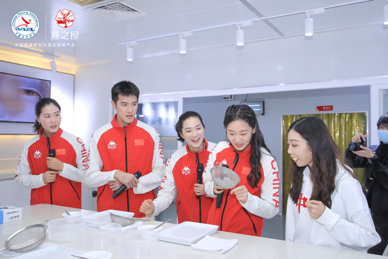 圖:中國國家擊劍隊(duì)隊(duì)員們體驗(yàn)燕窩挑毛