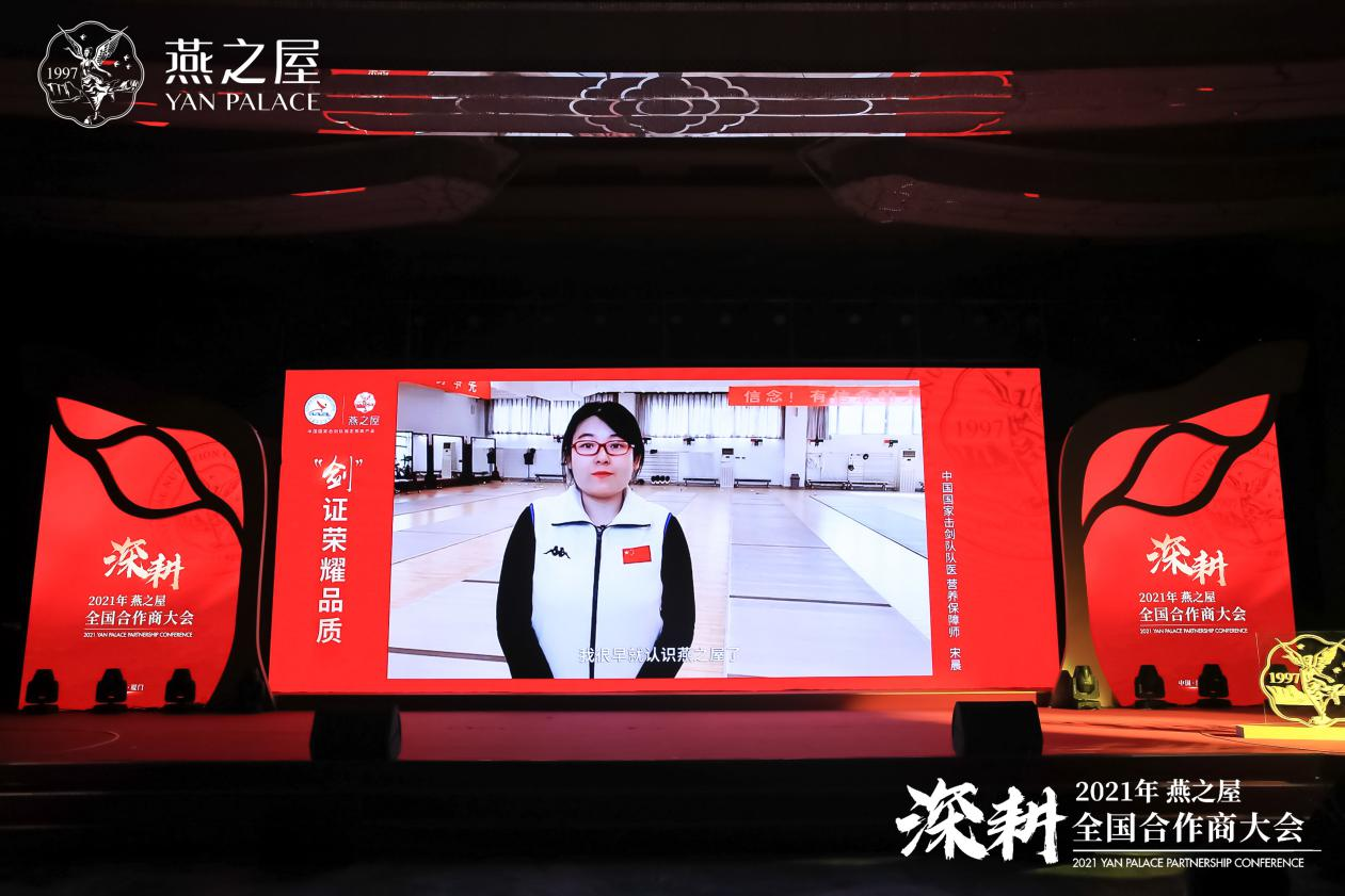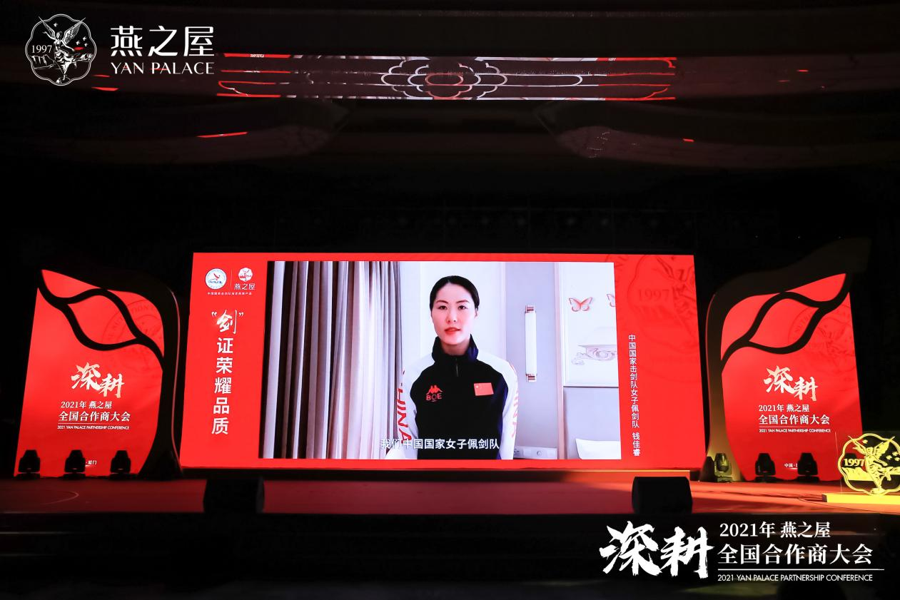 大會(huì)當(dāng)天,中國國家擊劍隊(duì)正在國外參加奧運(yùn)會(huì)資格賽,無法來到現(xiàn)場,他們通過視頻為“深耕”2021年全國合作商大會(huì)送上祝福,并由中國國家擊劍協(xié)會(huì)贈(zèng)送燕之屋榮耀金劍,“劍”證榮耀品質(zhì)。