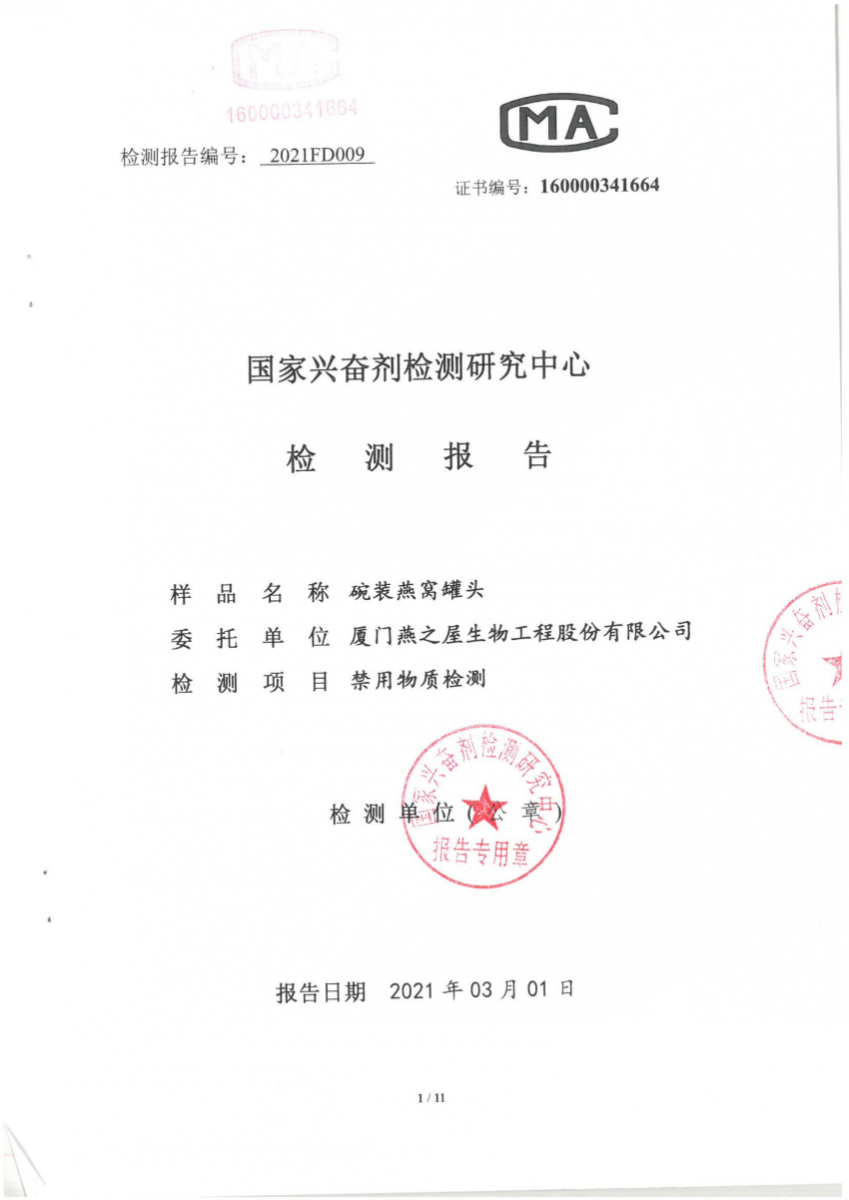 圖:燕之屋碗燕通過國家興奮劑檢測研究中心檢測