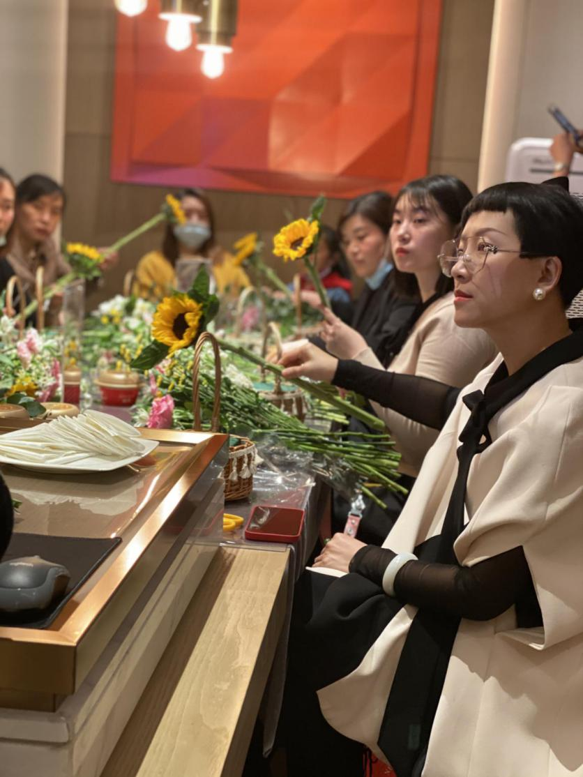 一只竹籃、兩三花團、點綴幾許新綠,心靈手巧的嘉賓們插花時一絲不茍,儼然一副大師的模樣,在老師的指導(dǎo)下細細擺弄,零碎的花枝細葉不一會兒便重塑新顏,展露出動人的風(fēng)致。每人憑借對美的不同理解,將普通的花草變成了一個個藝術(shù)作品。