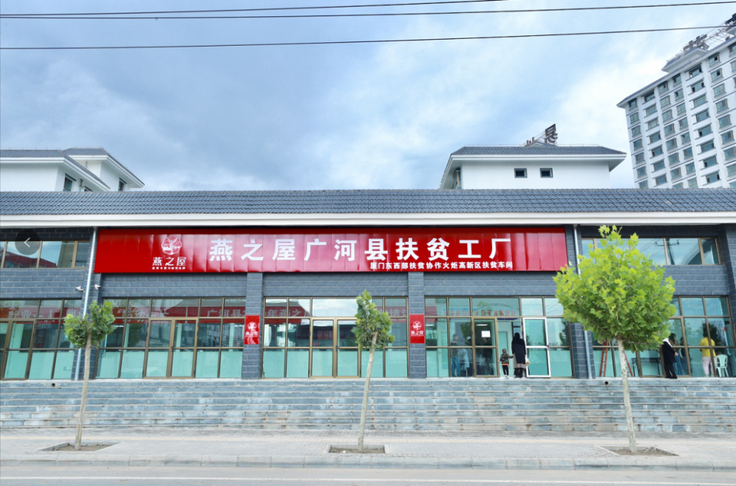 2019年,燕之屋到甘肅省臨夏州廣河縣開(kāi)展了產(chǎn)業(yè)扶貧計(jì)劃,深耕當(dāng)?shù)兀趶V河縣水岸花苑易地扶貧搬遷小區(qū)附近,建立燕之屋廣河縣扶貧工廠(一期),被當(dāng)?shù)厝擞H切的稱呼為“家門(mén)口的工廠”。當(dāng)年即帶動(dòng)就業(yè)112人,其中建檔立卡戶105人,占比總?cè)藬?shù)93.8%。