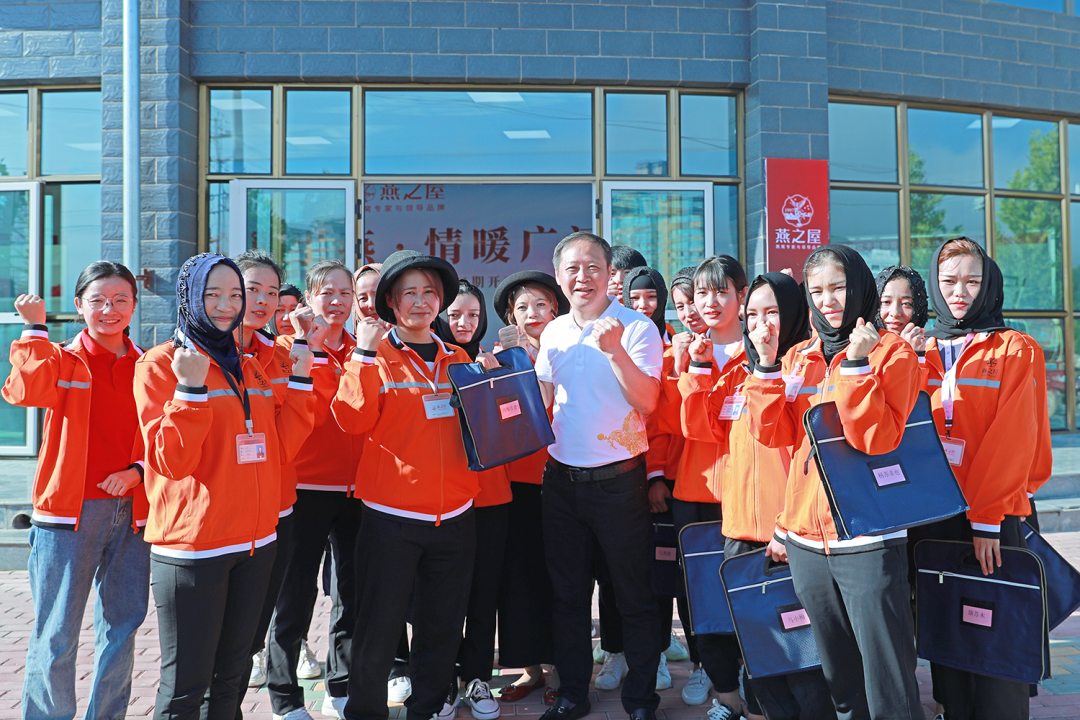 圖:燕之屋創(chuàng)始人、董事長(zhǎng)黃健與燕之屋廣河縣扶貧工廠員工合影