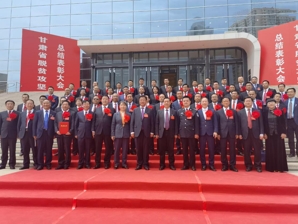 圖:甘肅省脫貧攻堅總結表彰大會參會人員合影留念、第一排右數(shù)第四位為燕之屋董事長黃健