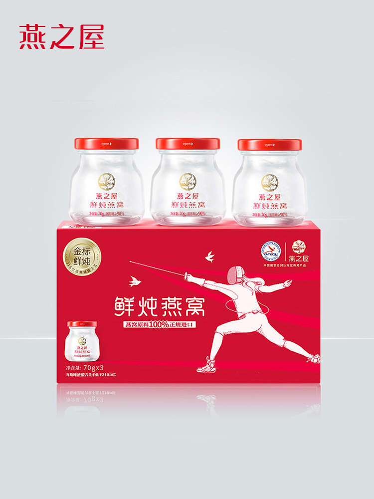 每一份奪冠套餐,內(nèi)含燕之屋金標(biāo)鮮燉燕窩(70g*3)。燕之屋金標(biāo)鮮燉燕窩(70g)燕窩酸每瓶含量≥210mg,比原來多出30mg,食用燕窩投料量每瓶不低于3.5g,投料足,份量滿,為中國國家擊劍隊(duì)出征奧運(yùn)獻(xiàn)上滿滿祝福。