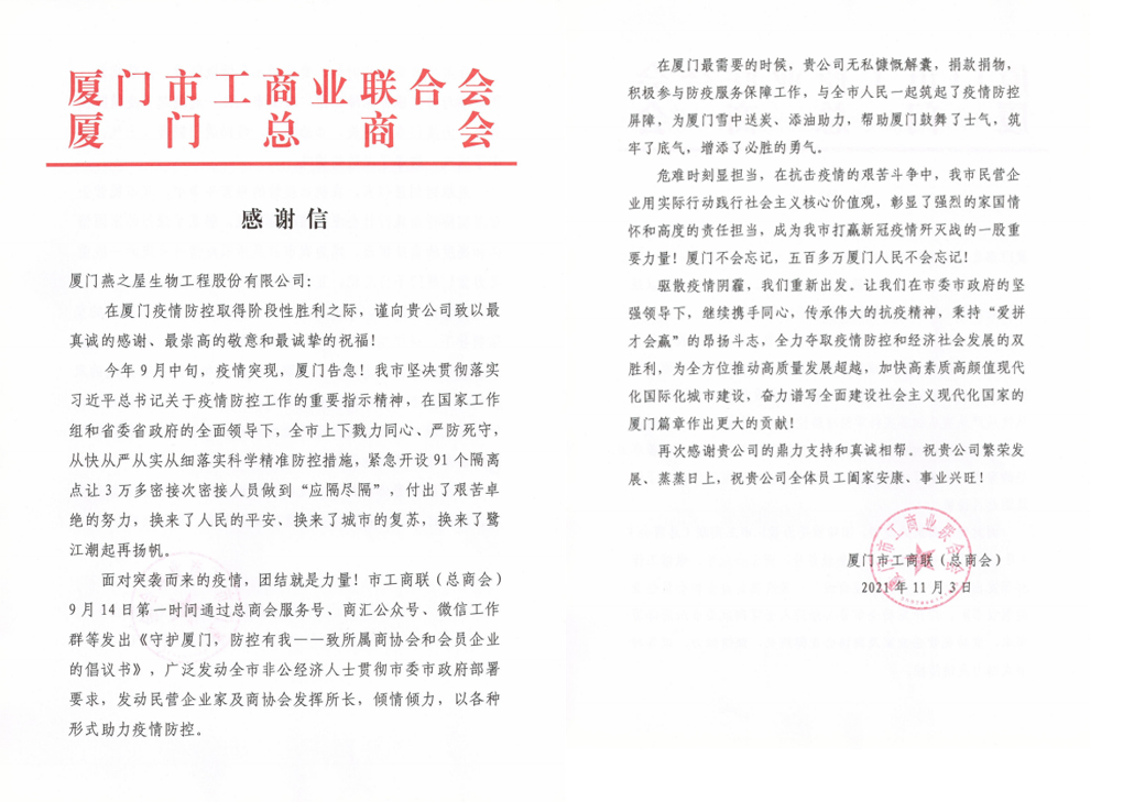 11月3日,燕之屋收到一封來(lái)自廈門(mén)市工商聯(lián)(總商會(huì))的感謝信,感謝燕之屋在廈門(mén)疫情防控取得階段性勝利工作中作出的貢獻(xiàn)。