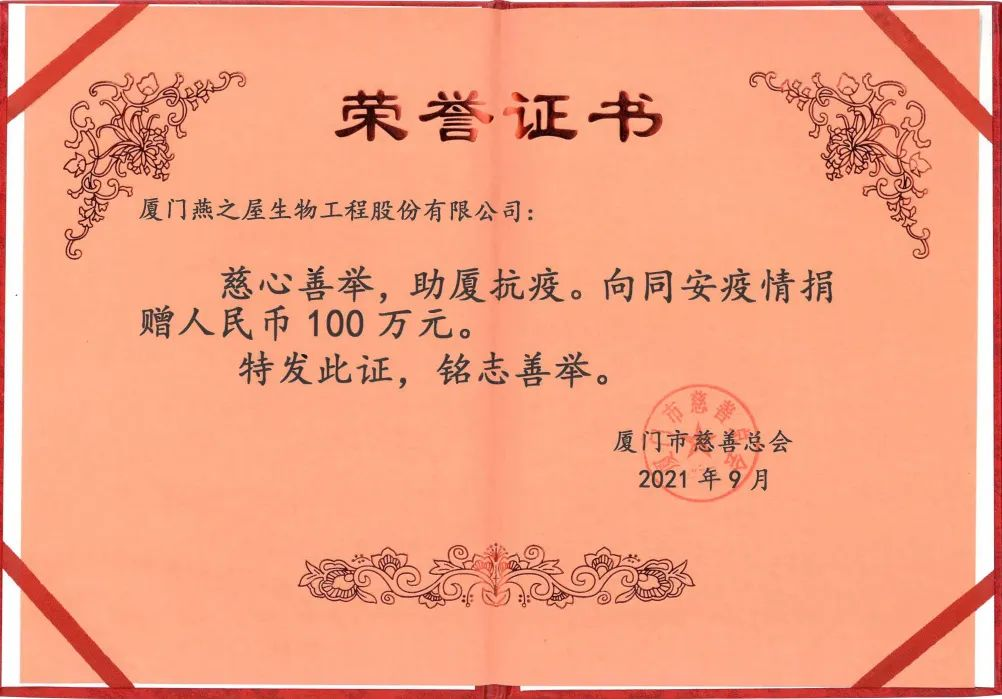 疫情發(fā)生的第一時(shí)間,作為扎根于廈門(mén),生長(zhǎng)于廈門(mén)的本土企業(yè)燕之屋,迅速投入抗疫行動(dòng)。9月24日燕之屋向廈門(mén)市慈善總會(huì)捐款100萬(wàn)元人民幣,專項(xiàng)助力同安區(qū)的疫情防控工作。燕之屋董事長(zhǎng)黃健表示:“燕之屋扎根廈門(mén)23年,在廈門(mén)母親的哺育下,燕之屋才得以發(fā)展壯大,我們熱愛(ài)這片土地,希望能夠在抗擊疫情的關(guān)鍵時(shí)期,為我們的城市貢獻(xiàn)一點(diǎn)綿薄之力。”