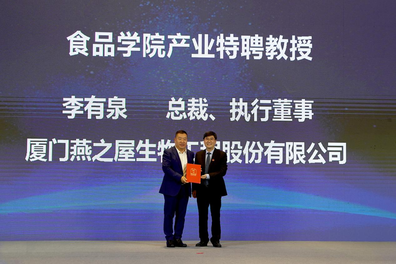 在同期論壇上,燕之屋總裁李有泉特受聘為江南大學(xué)食品學(xué)院“產(chǎn)業(yè)特聘教授”,由江南大學(xué)食品學(xué)院院長劉元法教授為其頒發(fā)聘書。