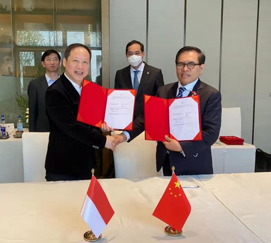 圖:印尼駐華大使周浩黎(前排右)與燕之屋董事長(zhǎng)黃?。ㄇ芭抛螅┖炗唴f(xié)議