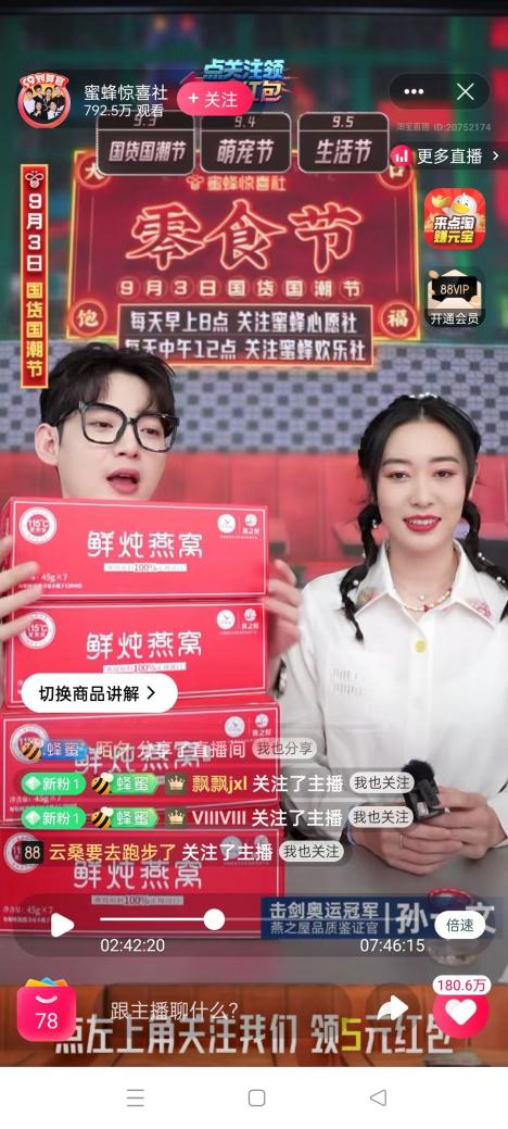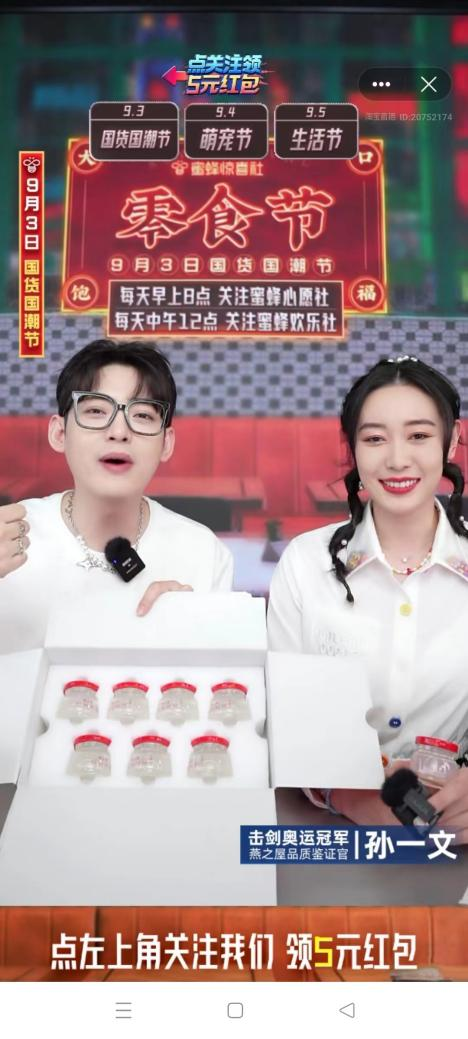 直播開始,孫一文親切地與粉絲們打招呼,并攜手蜜蜂驚喜社主持人在線派送福利,在直播間抽取了5名幸運粉絲送上燕之屋專屬福利——115℃鮮燉燕窩月卡。伴隨著“5、4、3、2、1”的倒計時,獲獎名單揭幕,直播間里人氣一路飆升。在隨后快問快答的環(huán)節(jié)中,孫一文與主持人的精彩互動更是逗樂眾人,在歡笑的氣氛中,傳遞出燕窩產品背后的滋補文化。眾所周知,國家運動員的飲食標準十分嚴格,除了健康,更重要的還有安全。孫一文也在直播中和大家分享,從健康出發(fā),所有入口的食品都必須經過興奮劑檢測。