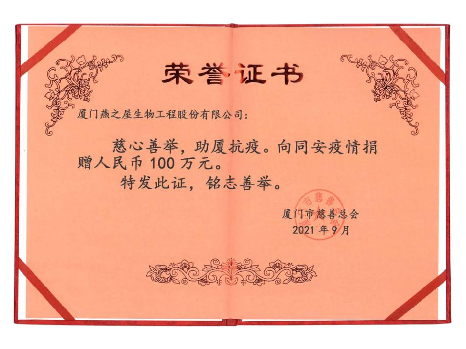 圖:燕之屋向同安疫情捐贈(zèng)人民幣100萬(wàn)元,獲廈門市慈善總會(huì)頒發(fā)榮譽(yù)證書