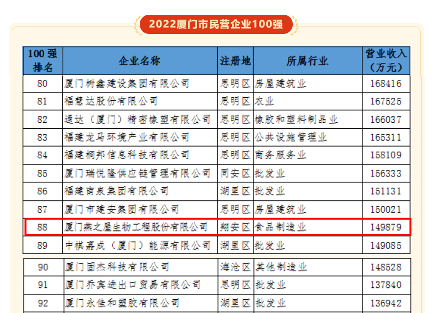 喜報(bào)!燕之屋入選廈門市2022年度龍頭骨干民營企業(yè)和2022廈門市民營企業(yè)100強(qiáng)