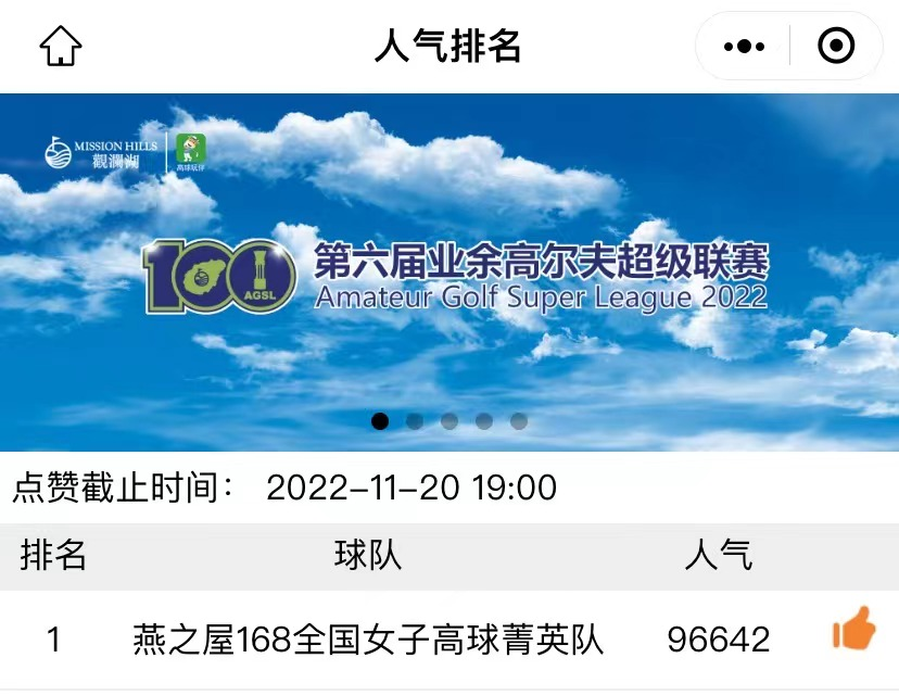 11月20日,2022第六屆業(yè)余高爾夫超級聯(lián)賽全國總決賽在??谟^瀾湖高爾夫球會圓滿收桿。經(jīng)過兩天激烈的角逐,燕之屋168全國女子高球菁英隊入圍前二十強,并榮獲網(wǎng)絡(luò)投票第一名。