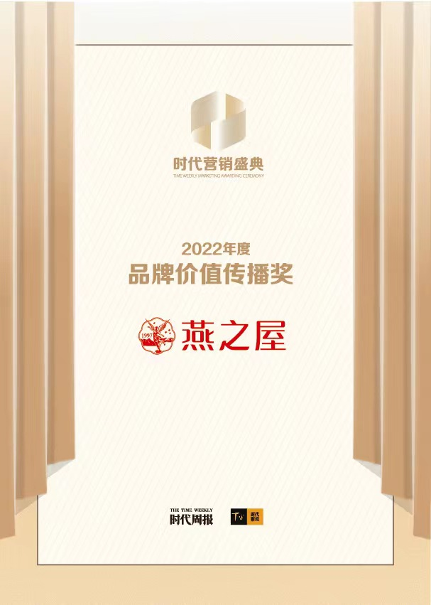11月22日,由時代傳媒集團(tuán)主辦,時代周報、時代財經(jīng)承辦的第十五屆時代營銷盛典獲獎名單重磅發(fā)布。燕之屋憑借良好的品牌影響力,榮獲2022年度品牌價值傳播獎。