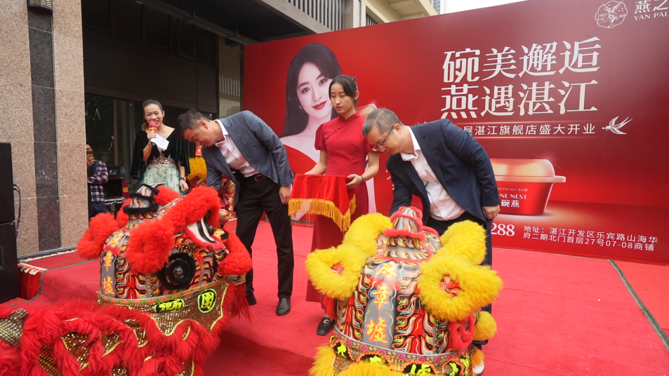 活動伊始,燕之屋湛江代理商莫干安發(fā)表開場致辭,拉開了慶典序幕。他首先對各位來賓表示歡迎和感謝,并說道:燕之屋品牌歷史悠久,多年來憑借高品質、高價值的產品實力,贏得了眾多消費者的青睞。隨后,在主持人的邀請下,數(shù)位嘉賓手執(zhí)金剪,共同為燕之屋湛江旗艦店剪下精彩的一刀。紅綢剛落,醒獅騰起,這一刻彩炮齊鳴、掌聲雷動,燕之屋湛江旗艦店正式開業(yè)。瑞獅送福,傳遞美好祝愿,醒獅點睛,寓意生財利市,開業(yè)慶典在熱鬧喜慶的氛圍中圓滿結束。