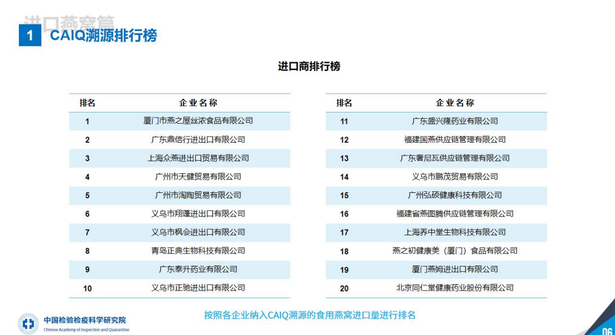 《CAIQ國內(nèi)燕窩進口商燕窩產(chǎn)品年進口量排行榜》榜首