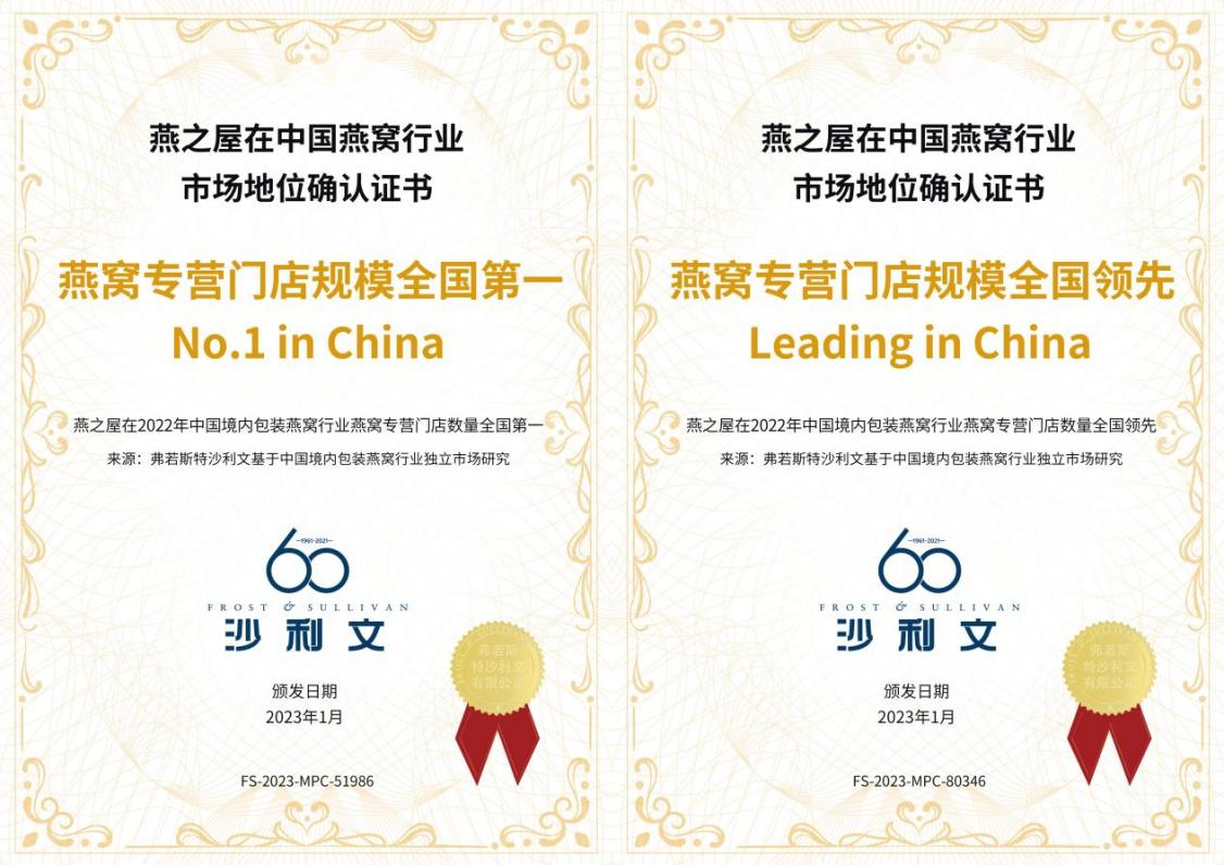 近日,燕之屋經(jīng)知名咨詢機(jī)構(gòu)弗若斯特沙利文有限公司認(rèn)證,獲得四項(xiàng)2022年度中國(guó)燕窩行業(yè)市場(chǎng)地位確認(rèn)證書(shū),分別是燕窩工廠規(guī)模全國(guó)最大、燕窩工廠規(guī)模全國(guó)領(lǐng)先、燕窩專營(yíng)門(mén)店規(guī)模全國(guó)第一、燕窩專營(yíng)門(mén)店規(guī)模全國(guó)領(lǐng)先,2022年度雙料全國(guó)第一的佳績(jī),足見(jiàn)品牌強(qiáng)勁實(shí)力。